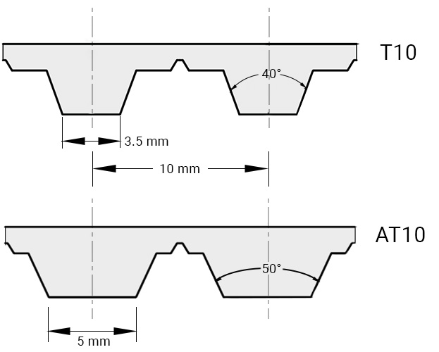 同步带来在各种系列和螺距。齿距是指从齿中心到齿中心的齿间距。该系列是指齿的样式或轮廓,并提供了额外的方法分类皮带。同步带齿可以是圆形或梯形,形状的任何这些也可以从系列不同的系列。请看下面的例子显示一个T10同步带,与AT10同步带-两者都有一个10毫米间距。